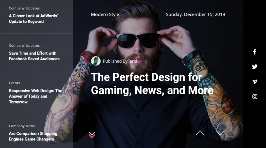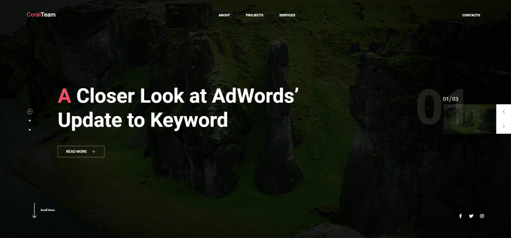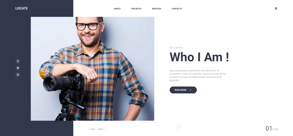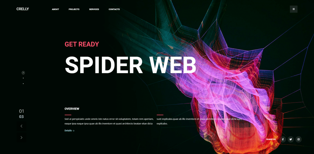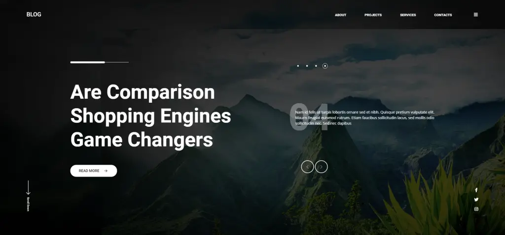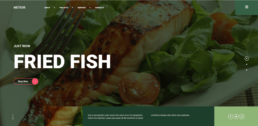 Dot navigation placement on the right side and the social media icons on the bottom right corner give it more advanced and modern looks.