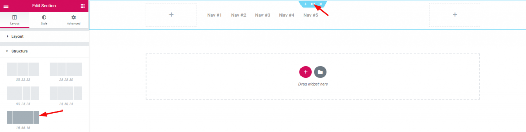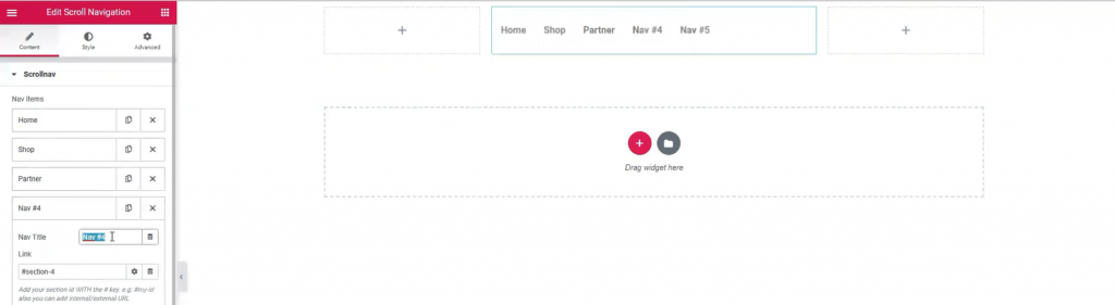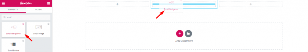 Drag and drop the Scroll Navigation widget from Element Pack into the middle section. The widgets will make your header menu.