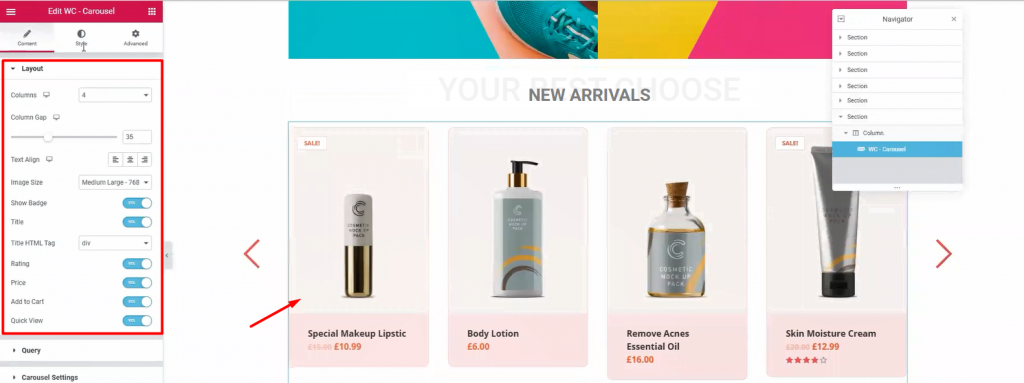 Next, drag and drop WooCommerce Carousel widget from Element Pack below the heading. With it, you can show your newly added products together. Moreover, we use WooCommerce Slider widget to highlight products with a wide view. On the other hand, using this widget, we can show all the products in 4-5 columns. It’s a handy tool for your WooCommerce custom product page.