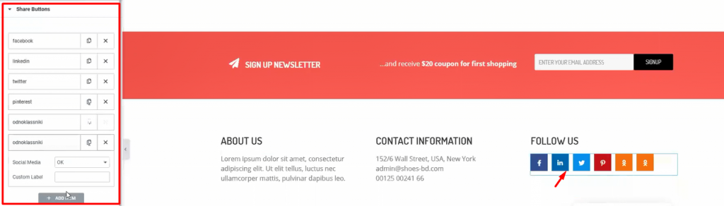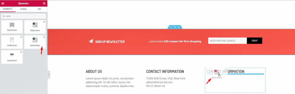 For the 1st and 2nd column, a title and some text are enough. Let’s move to the 3rd column. Adding a title and Social Share widget (by Element Pack) inside it.