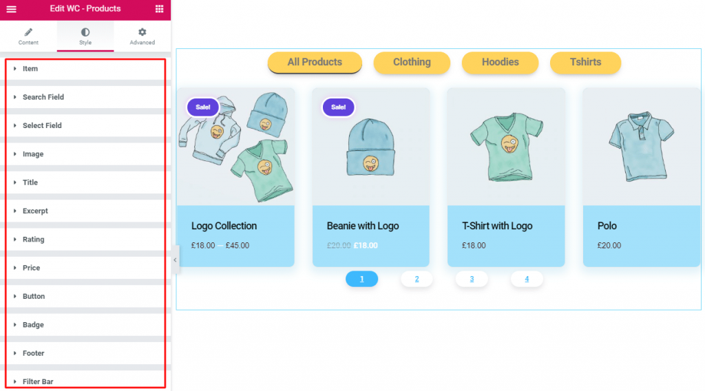For styling, you will have to Style Tab and give style as you can see the below screenshot. Here, you’ll be able to style the content section by section such as Item, Search Field, Select Field, Image, Title, Excerpt, Rating, Price, Button, Badge, Footer, Filter Bar.