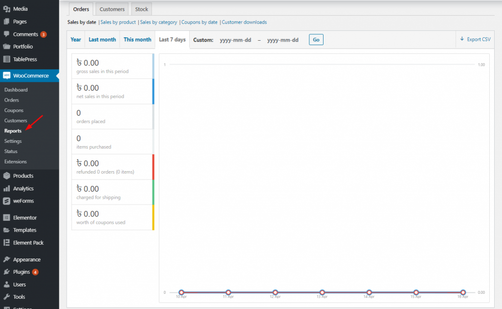 Moreover, along with sales by product, categories, coupons used or customer downloads, you may find detailed information on customers, taxes, and stock.