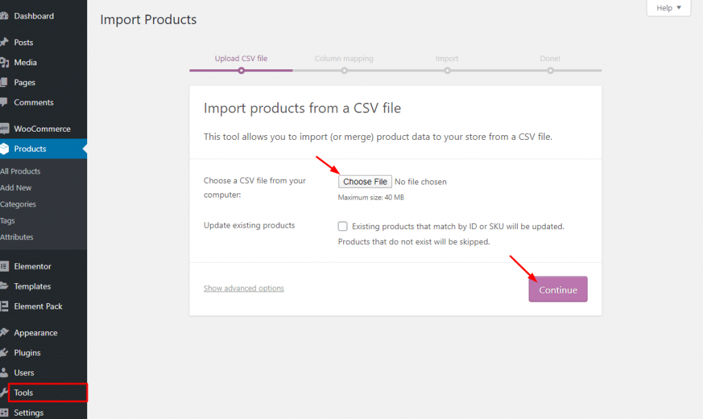 step-2: If you want you can show sample_products data in CSV/XML file provided by WooCommerce. Simply go to Tools > Import > WooCommerce Products(CSV)> then hit on the Run Importer. You can do this only for demo purposes.