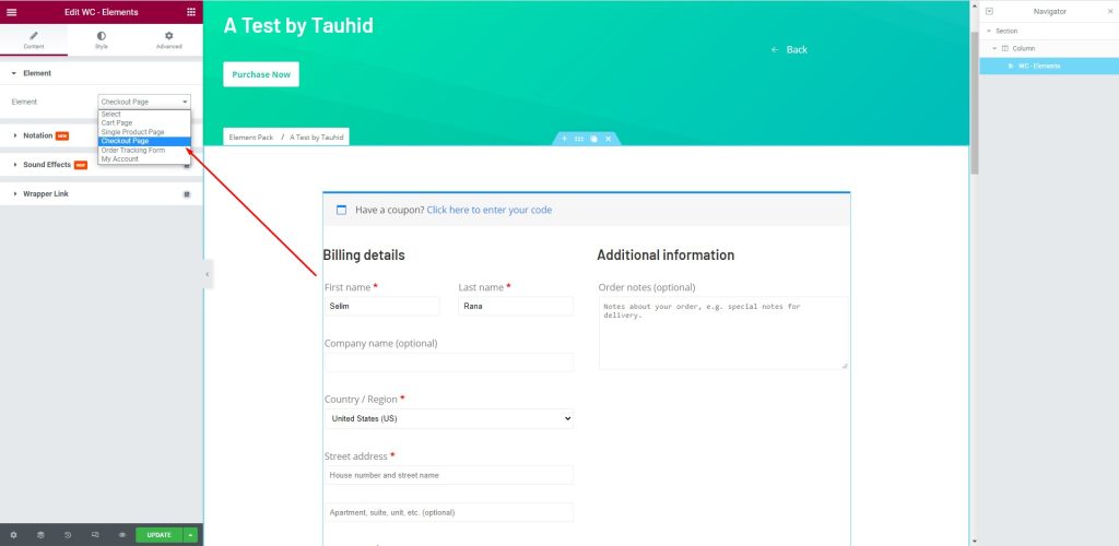 Next, go to Element > Element > Checkout Page to create a checkout page that will help you manage your customers. There are several fields to fill up with consumer information. You can provide your name and address here.