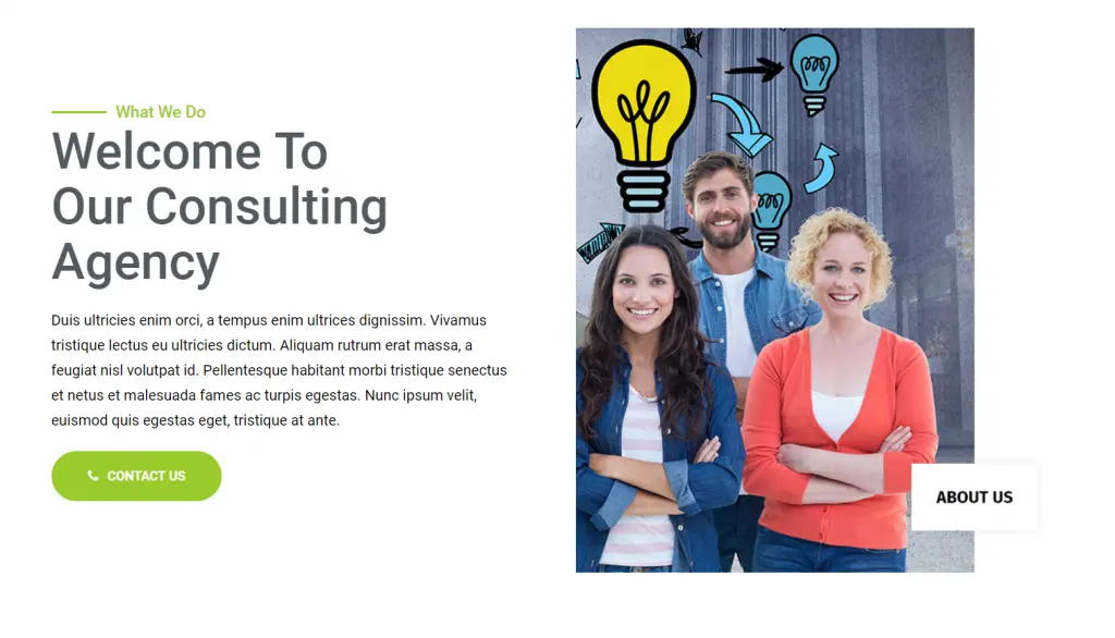 Our About us section will contain 2 columns. One of them will have a heading with a paragraph and button to the contact form. The next column will have an image.