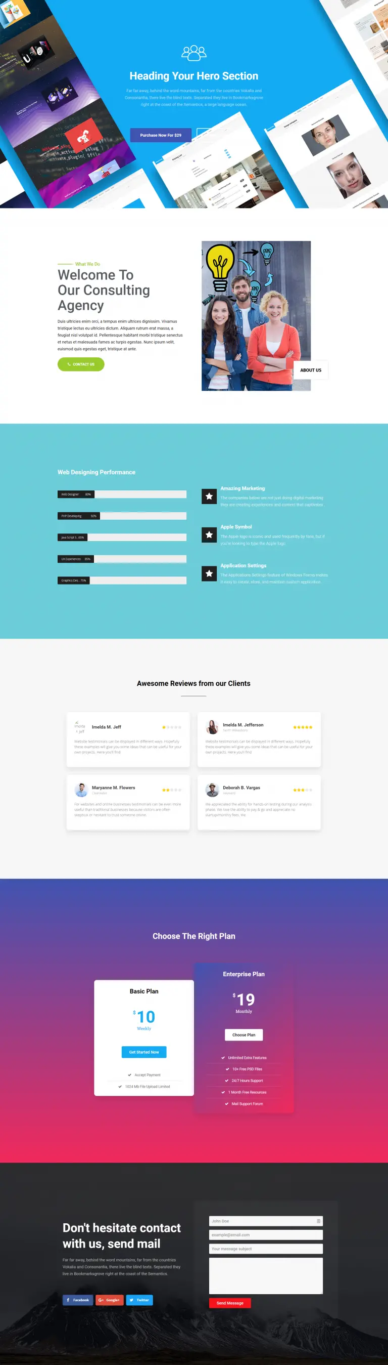 Our top hero section will contain background image, text, icons and buttons to attract visitor’s attention.