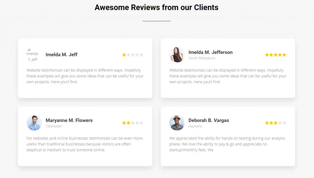 We will have a heading before the actual testimonial begins. Our testimonials section will contain 2 columns. Each column will have a picture and description. This will be an advanced box design