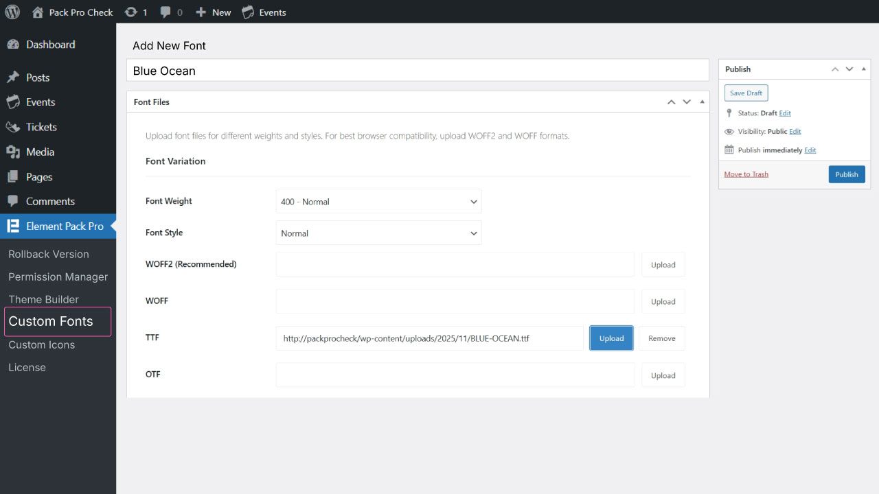 From the Element Pack Dashboard, click on “Custom Fonts.” Next, select “Add New Font”, enter your font name, and upload the desired font file. The recommended format is WOFF2, but you can also use WOFF, TTF, OTF, EOT (for IE), or SVG (legacy) formats. Finally, click Publish to save your font.