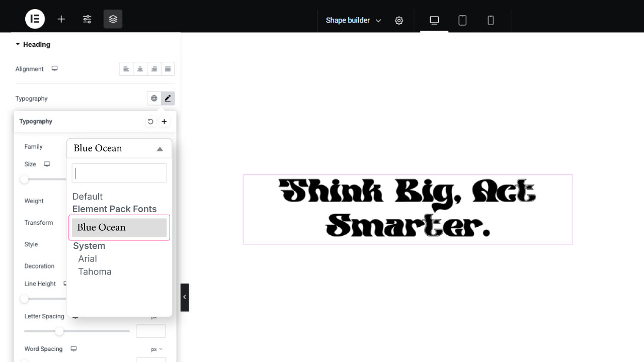 You’re now ready to use your custom font. Simply click on Typography, type your font name in the search bar, and select it to apply the font to your design.