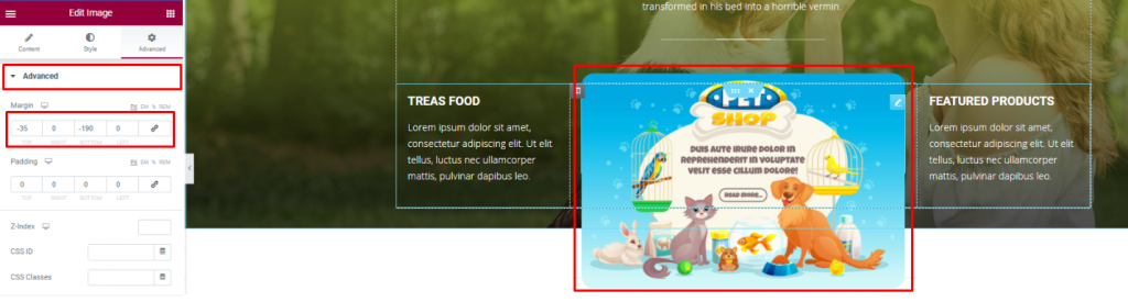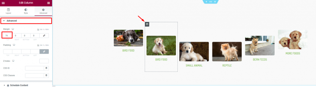 Second, go to column settings and in the Advanced tab, consecutively adjust their margin. Just then, you will get a nice curved pet image gallery.