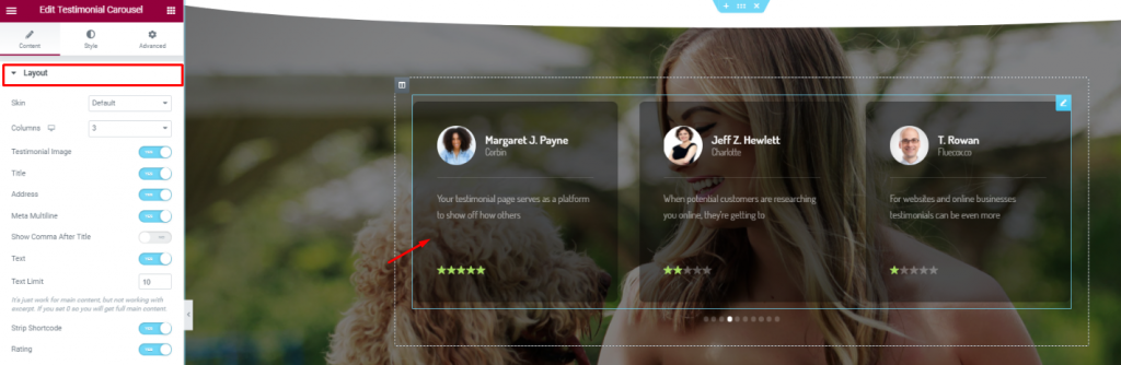 On a new section, insert the Testimonial Carousel widget in the middle of the section. Make the color a bit transparent from the Style tab.