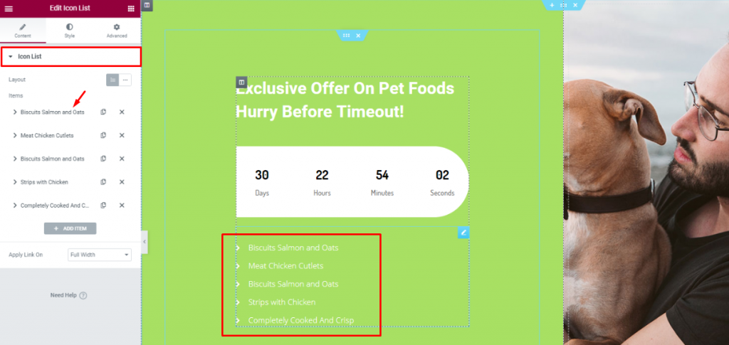 Insert the Icon List widget below the counter to show the offer contents.