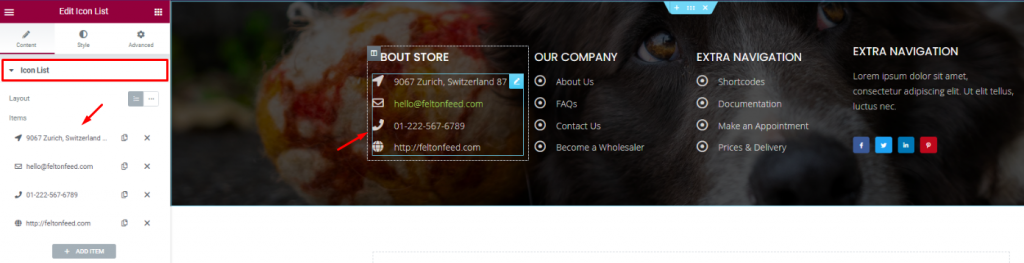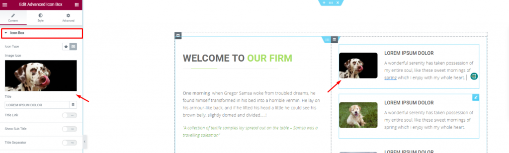 Placing the Advanced Icon Box widget on the right side of the column for pet descriptions.