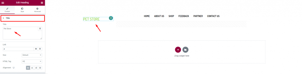 Insert the shop name/logo on the top left corner of the header. We inserted the Heading widget by Elementor and put the shop name in texts.