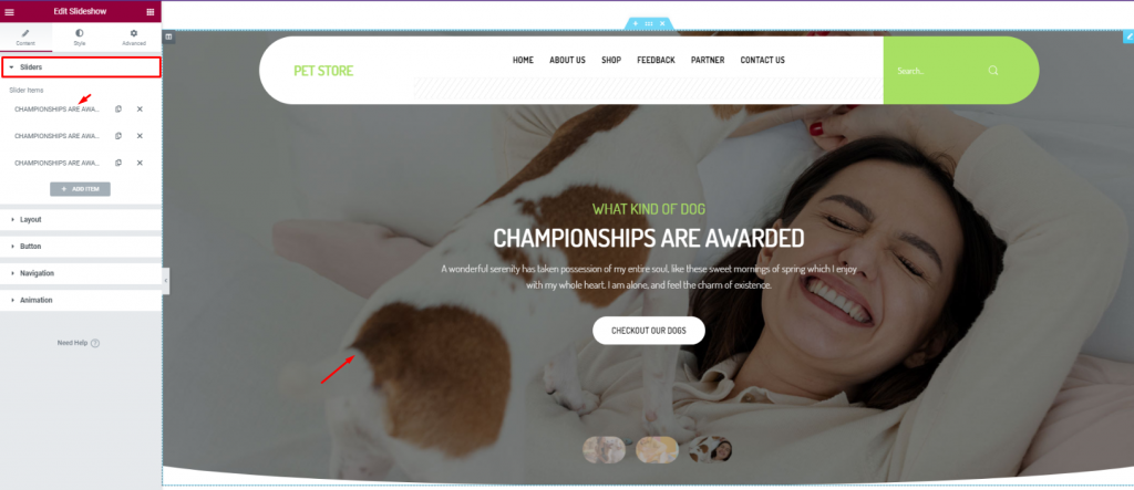 Finish the header design of the pet shop website by using a gradient background color from the section settings. Don’t forget to put a Search widget on the top-right corner.