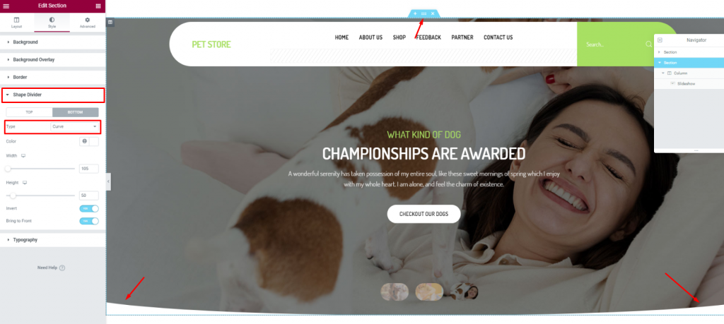 To add more style to the slider image, you can try to curl up the edges. To do that, you need to go to the section settings> Shape divider> and choose Curve from the Option Type.