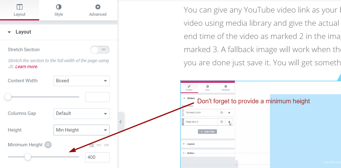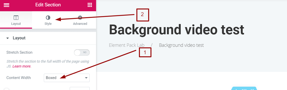 I have selected it as boxed because I am creating a blog post. You can give also give full width. Now the fun part begins. To add a video please click to the Style tab marked as 2 in the image above.