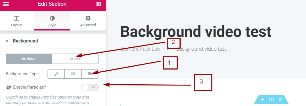 Once you clicked on the video icon marked as 1 in the picture above, you will see some new options. You can also select the hover effect from the option marked 2. You can add some particle effect too by enabling the particles from the option marked 3. Once you click on the video icon, you will see the following option.