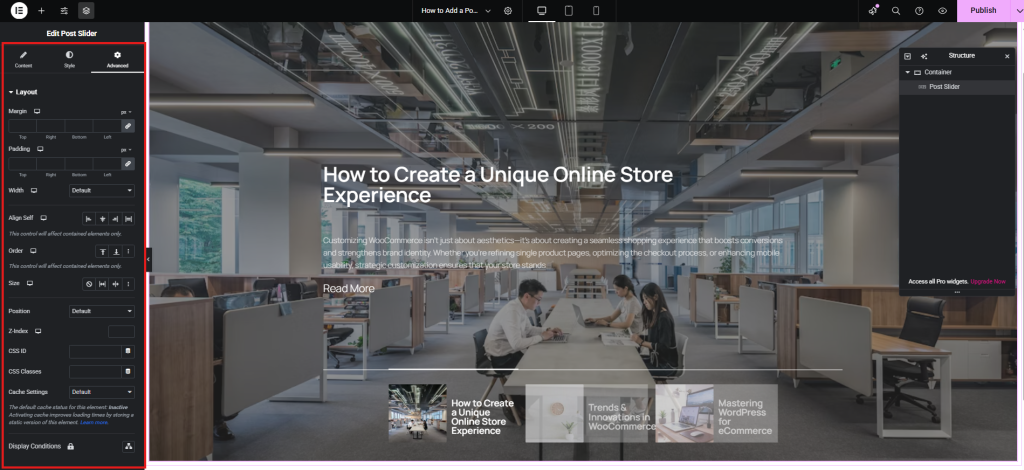 For a fully customized slider, use the Elementor Pro Slides Widget. These tools allow advanced customization, including dynamic content, animations, and tailored design elements. You can also use Ultimate Store Kit for extra WooCommerce-specific slider features.