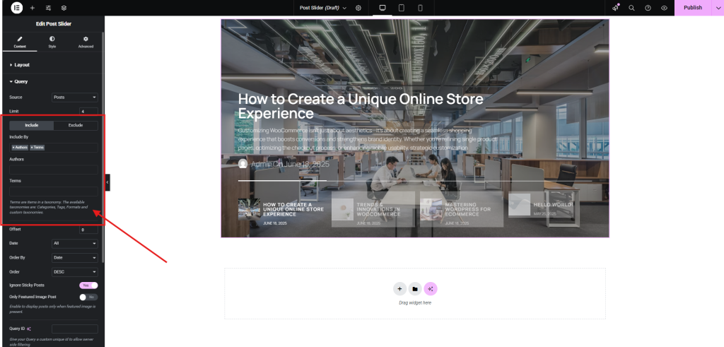 - Control What Shows Up You don’t want just any post sliding through. Use the query controls to show only the posts that matter—by category, tag, or even a manual selection.