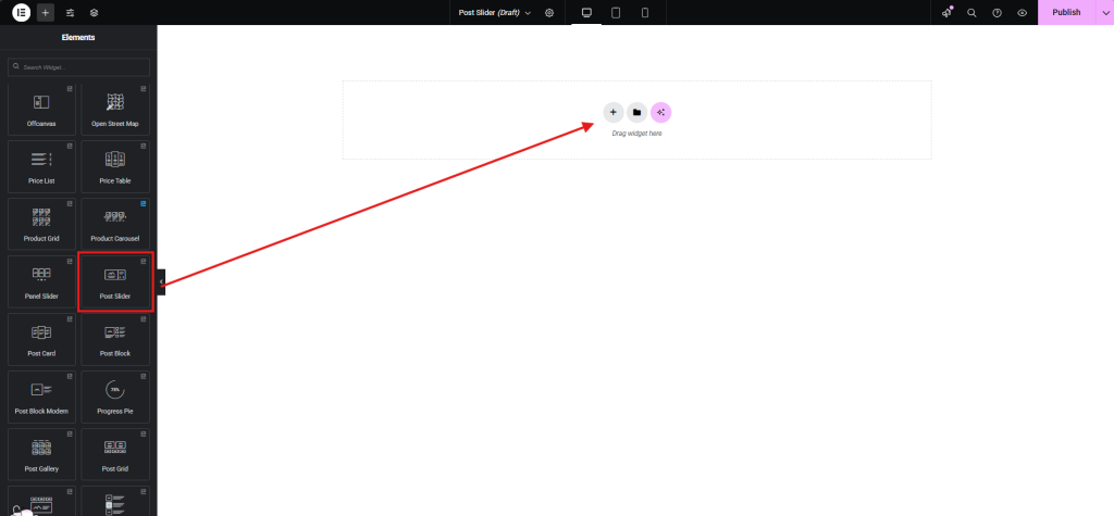 Find the “Post Slider” or “Post Carousel Slider” widget in the Elementor widgets panel.