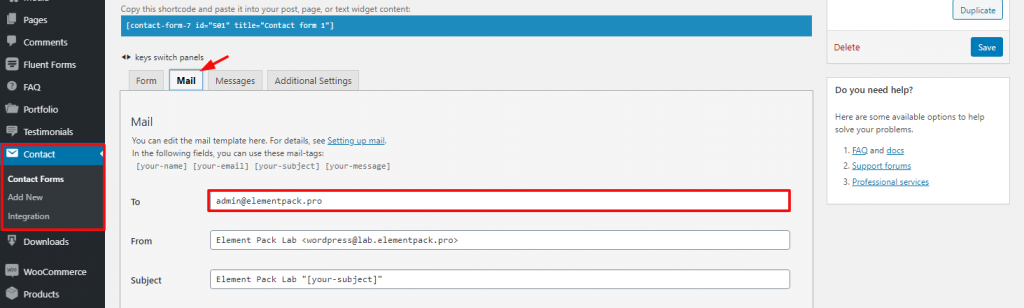 Now, go to the Mail tab beside the Form tab. Here, you have to configure the receiving mail address and the masked texts of the form body.