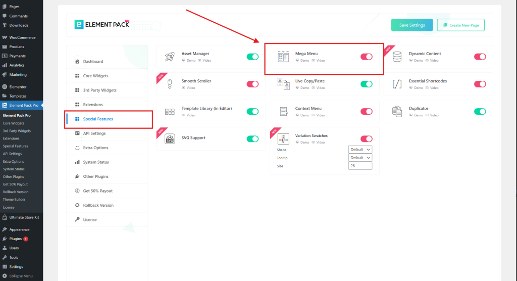 Enabling the Mega Menu feature in Element Pack Pro involves adjusting several settings within the WordPress dashboard. So,