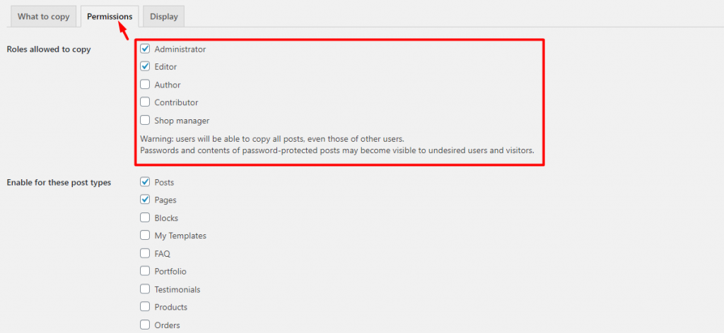 Next, you can select from the Permissions. This option lets you choose who can copy your post. The settings below Enable for these post types lets you choose what type of post to copy.