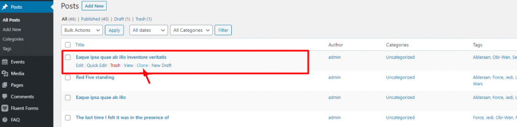 Go to your WordPress Dashboard> Posts> All Posts. There, you can choose any of your post. Then, hover over the post you want to duplicate in WordPress. You will see two new options appear beneath them; Clone & New Draft.