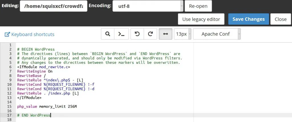 Now, open your htaccess file to edit on the browser and add these line to the file and click on save.