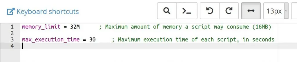 memory_limit = 256M; Maximum amount of memory a script may consume (16MB) max_execution_time = 90; Maximum execution time of each script, in seconds