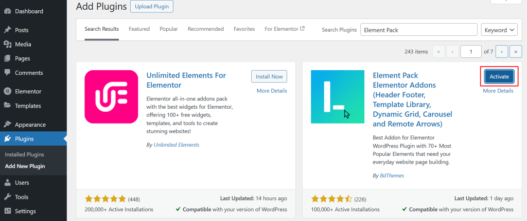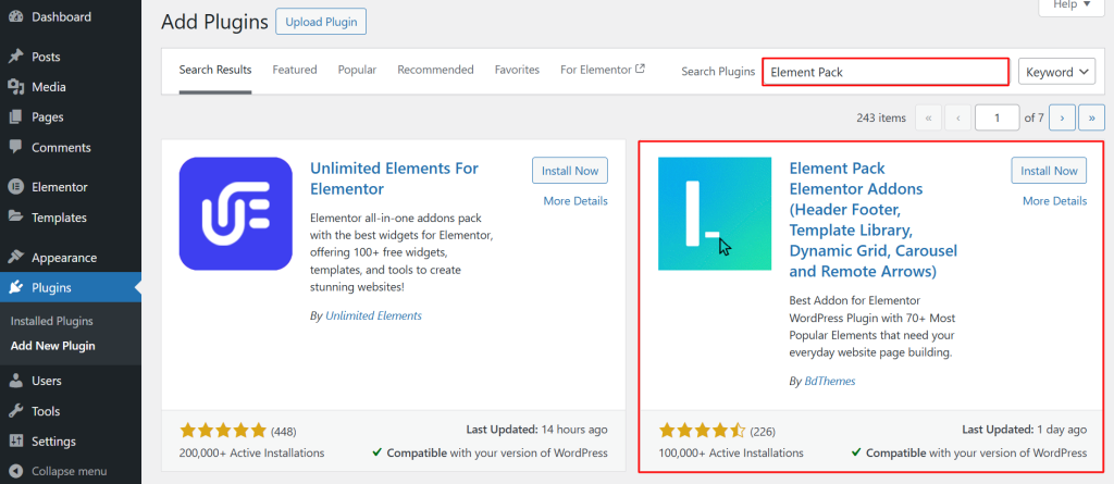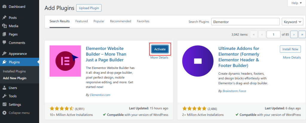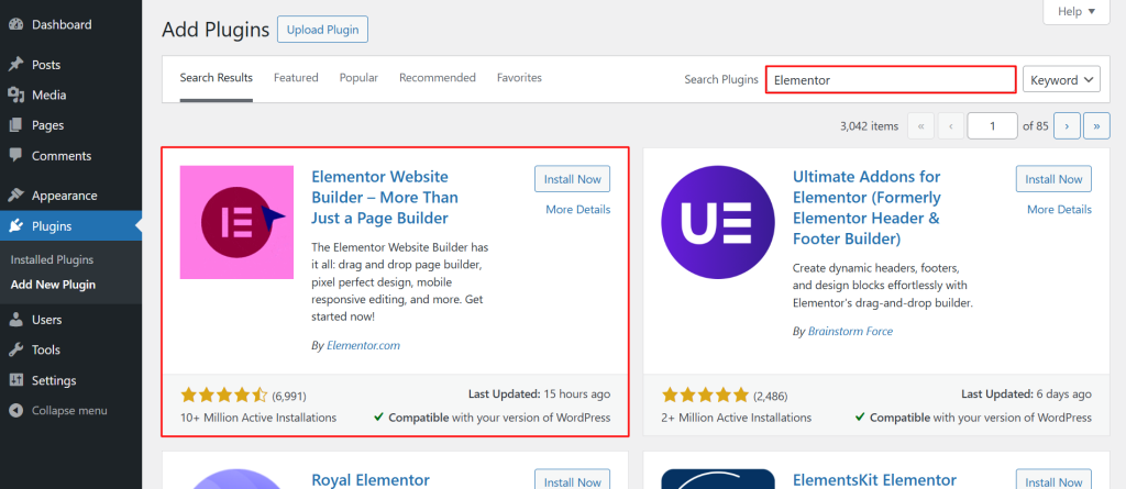 - Click the Install Now button next to the Elementor plugin. This process might take a few seconds, depending on your internet speed.
