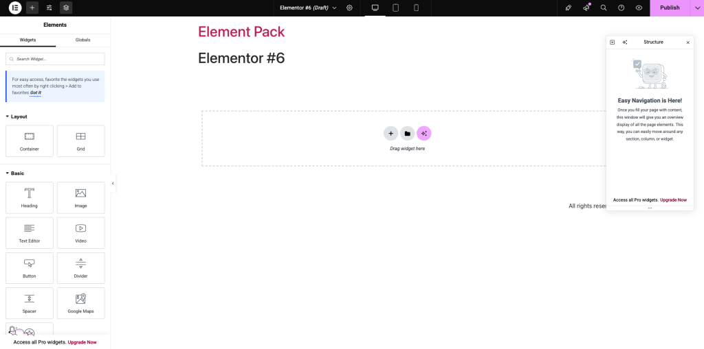 Finally, you’ll get the Elementor editor panel up and running to design and develop your website.