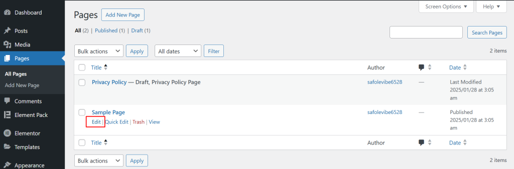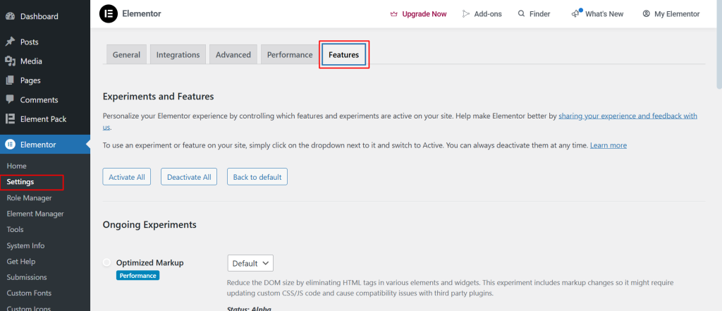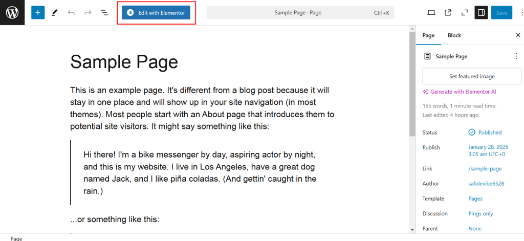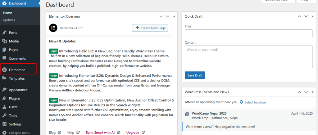 You’ll see a new menu item called Elementor in the WordPress admin dashboard. This is where you’ll access settings, start designing, and manage your templates.