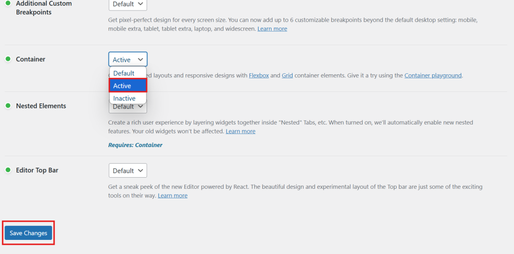 To ensure that you can access the Elementor Pack with the editor, you have to activate the container.
