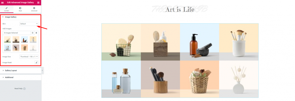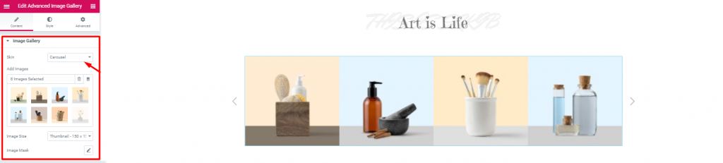 First things first. The first section you will see is the Image Gallery. Here, you have to pick the images that you want to show. Also, you will have a drop-down option ‘SKIN‘. From there, you can select the showcase style for the photo gallery website.