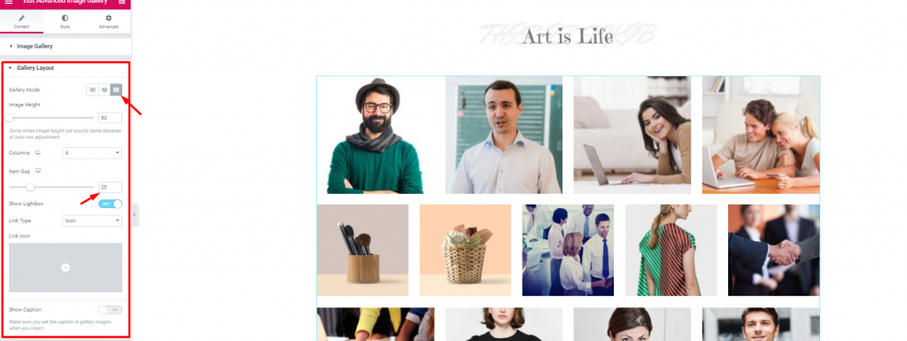 Well, to be frank, this advanced image gallery supports 3 different image alignment styles. Moreover, you can choose them from the Gallery Mode option. The image above is showing ‘Justified’ mode. In fact, this mode groups up images with similar height.