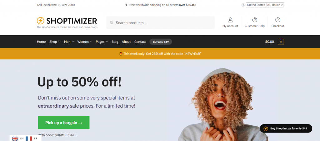 Astra offers its main theme as a free source for users across the world. Also, you can get the pro version of it at $59. Get this WordPress WooCommerce compatible theme right now.